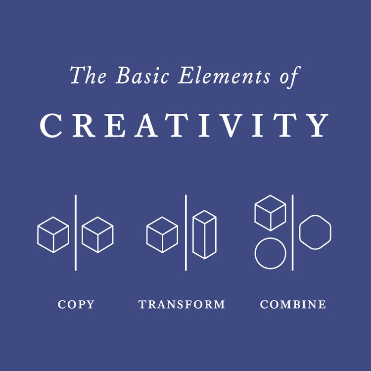 Seriously, even Ferguson’s “Merch” that features the logo above and his “The Basic Elements of Creativity” graphic below are ultimately “remixed” artifacts…Be sure to watch the video below by class (Thursday, 5/1/25 – as listed on the course schedule) to gain insight into the remix process and conceptual definitions.